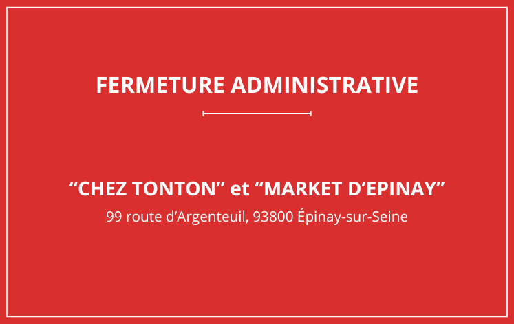 La Ville informe les habitants qu’une fermeture administrative a été prononcée à l’encontre des établissements « CHEZ TONTON » et « MARKET D’EPINAY » situés sur le territoire communal, au 99 route d’Argenteuil à Épinay-sur-Seine.