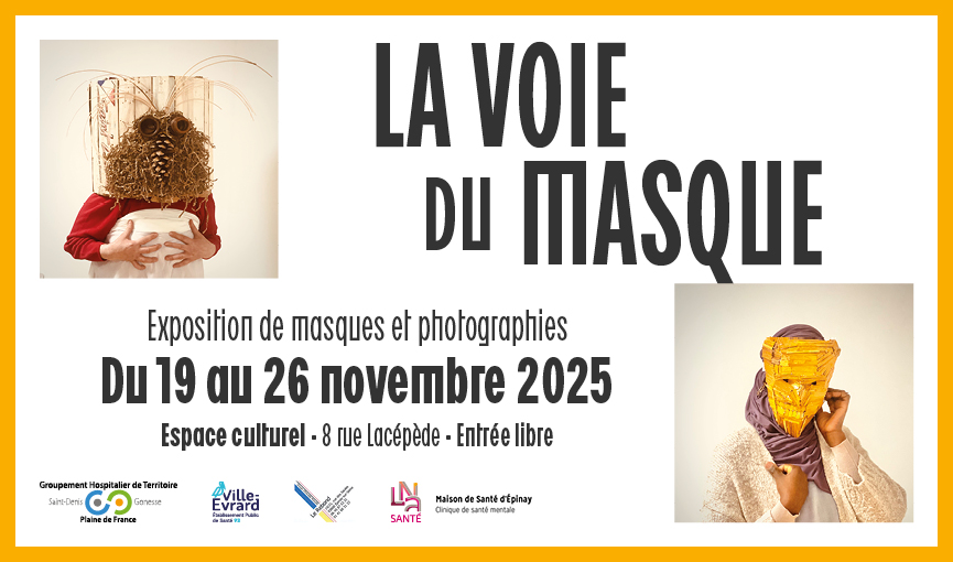 Espace Culturel De 09:00 à 18:00L’exposition « La Voie du masque » dévoile les oeuvres de cinquante artistes amateurs ayant participé à des ateliers menés par le Centre médico-psychologique pour enfants et adolescents d’Épinay-sur-Seine. Soutenu par le Conseil local de santé mentale intercommunal, ce projet collectif explore la pratique artistique via la fabrication de masques divers et variés. Réalisés avec diverses structures locales, les masques conçus en tissu, plâtre ou papier mâché dialoguent avec les photographies de Nadine Lorentz, Marc Lacouture, Tonny Louis et Doc Data.