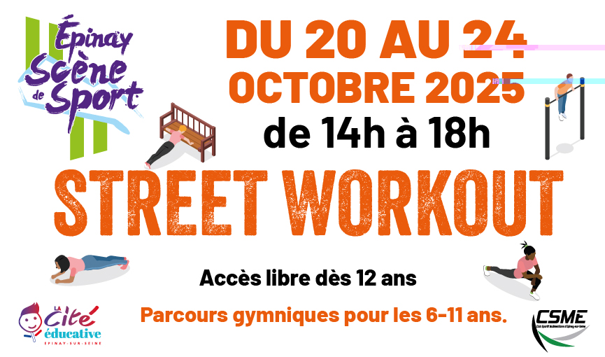 De 14:00 à 18:00À chaque période de vacances, Scène de Sport propose, dans différents lieux de la ville, des activités sportives gratuites pour tous, mêlant fun, découverte et convivialité. À la Toussaint, c’est le street workout qui sera à l’affiche. Née dans les quartiers populaires de New York, cette discipline mêlant gymnastique et musculation, pratiquée dans les parcs et installations urbaines, est aujourd’hui devenue un mouvement mondial, symbole d’entraide et de dépassement de soi. Chaque après-midi, de 14h à 18h, les Spinassiens pourront s’y initier gratuitement lors d’ateliers itinérants, à Orgemont, La Source–Les Presles et dans le centre-ville. Au programme ? Pratique pour tous, démonstrations, challenges et animations musicales.